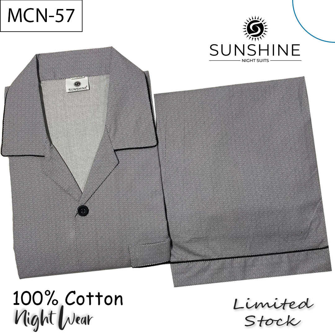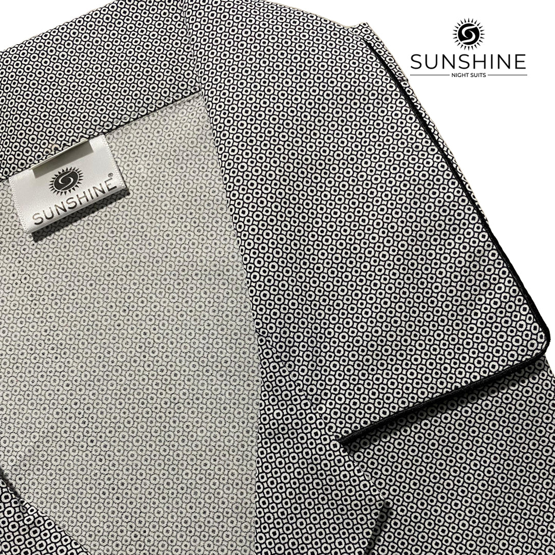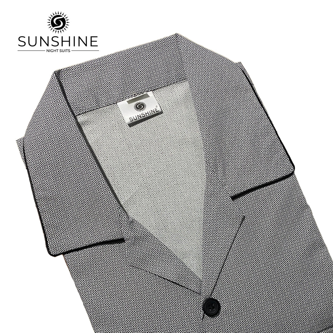 Experience ultimate comfort and style with our MCN-57 Black Geometric Printed 100% Cotton Night Suit for men. Made from imported cotton fabric, this set includes a pajama with an elastic waistband and a side pocket for added convenience. The full-sleeved shirt features a front patch pocket and stylish contrast piping, adding a sophisticated touch. The pajama is designed with a button fly closure for ease. This cozy and functional night suit offers style and comfort, perfect for a restful night's sleep.