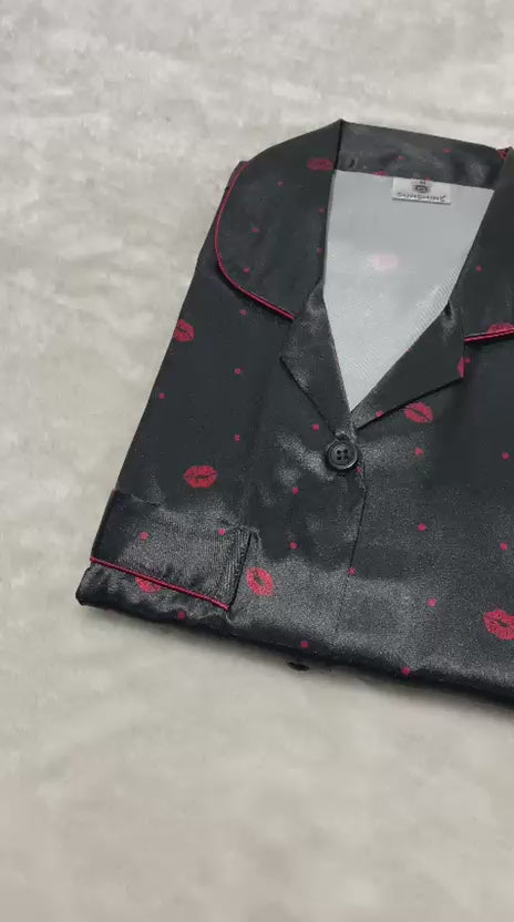 Fall in love with bedtime in our DPS-02 Black Red Lips Digital Printed Silk Nightdress for Women!