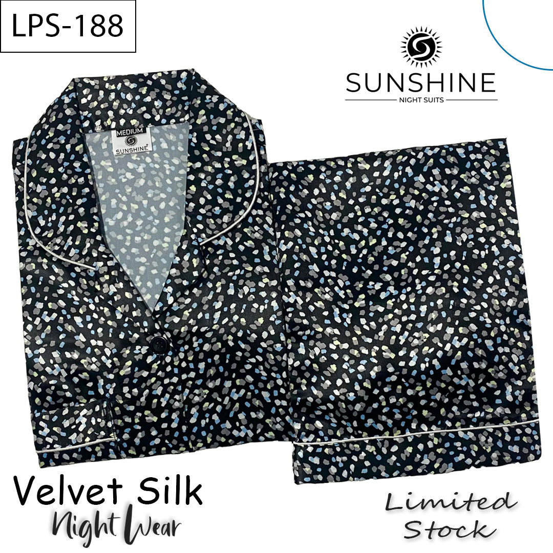 Feel fancy in our Black Strokes printed silk nightdress for women, LPS-188! It's made in Pakistan with silky fabric from China. The set has a comfy full-sleeve shirt with a pocket and pajamas with a stretchy waistband. The pretty contrast piping adds a touch of style, making bedtime feel super luxurious. Elevate your nights with this comfy and chic outfit!