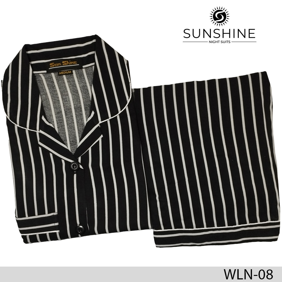 Elevate your sleepwear with our Black White Stripe Printed Linen nightdress for women (WLN-08). Made from premium Boski Linen Fabric imported from China, this unique set features a button-up front, notch collar, and a full-sleeved shirt with a front patch pocket. The ensemble includes a matching pajama with an elastic waistband and side pocket, offering both comfort and style for a restful night's sleep.!