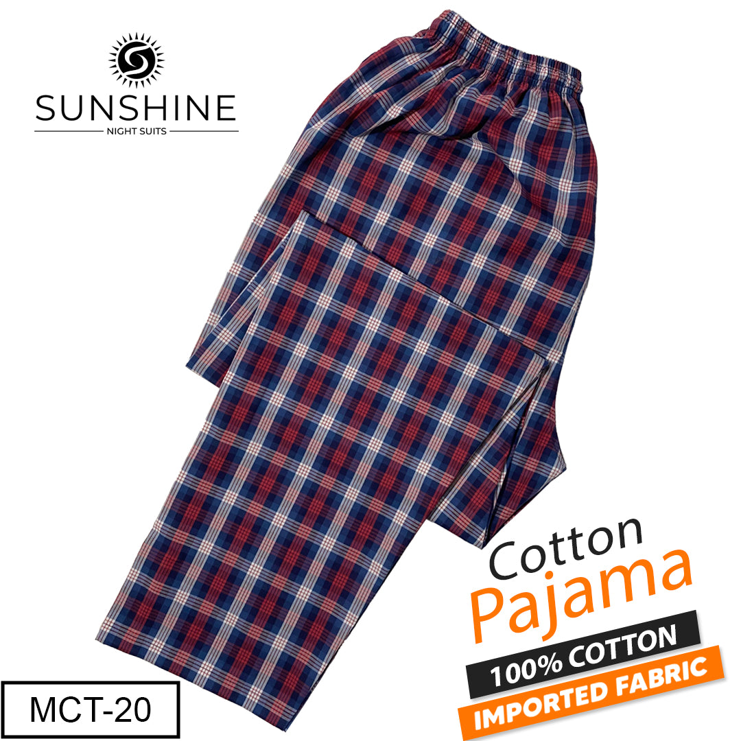 Upgrade your sleep with our MCT-20 Blue Red Check Cotton Pajamas For Men. Crafted from 100% imported cotton, they're soft and breathable. Features include convenient side and back pockets, and an elastic waist with an adjustable drawstring for a personalized fit. Sleep in comfort and style.
