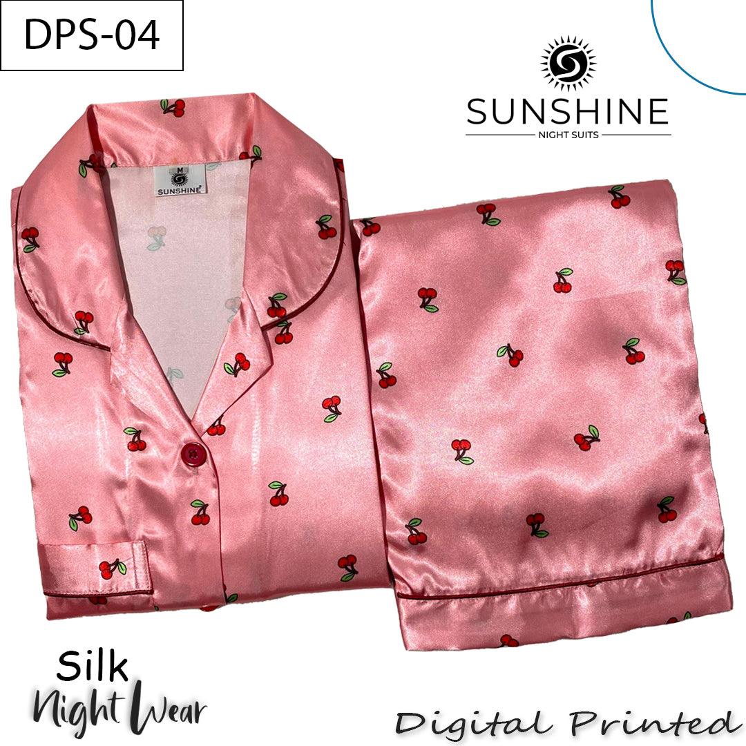 Fall in love with bedtime in our DPS-04 Blush Pink Cherry Digital Printed Silk Nightdress for Women!