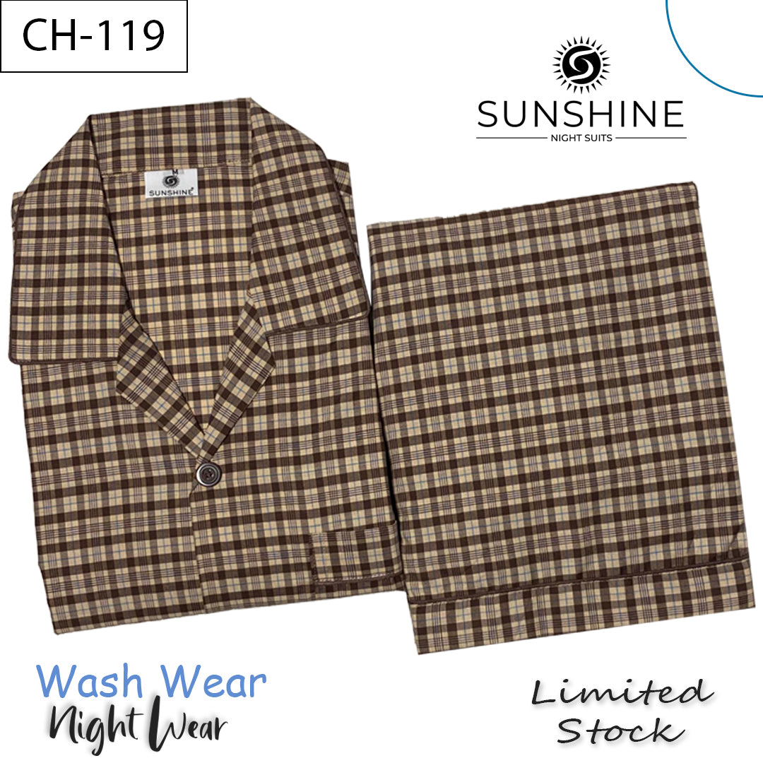 Discover comfort and style in our Ch-119 Dark Fawn Check Night Suit for Men. Easy-care Wash & Wear fabric ensures convenience. The pajama, with an elastic waistband, side pocket, and button fly closure, guarantees a perfect fit. Paired with a full-sleeved shirt featuring contrast piping and a front patch pocket, this set offers a classic and comfortable loungewear solution. Unwind effortlessly in this modern ensemble.