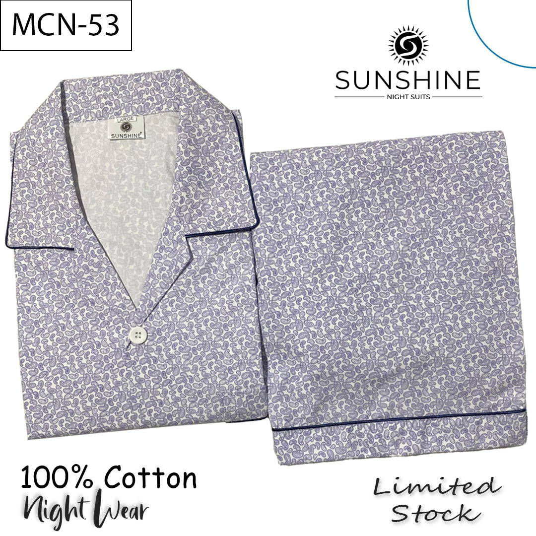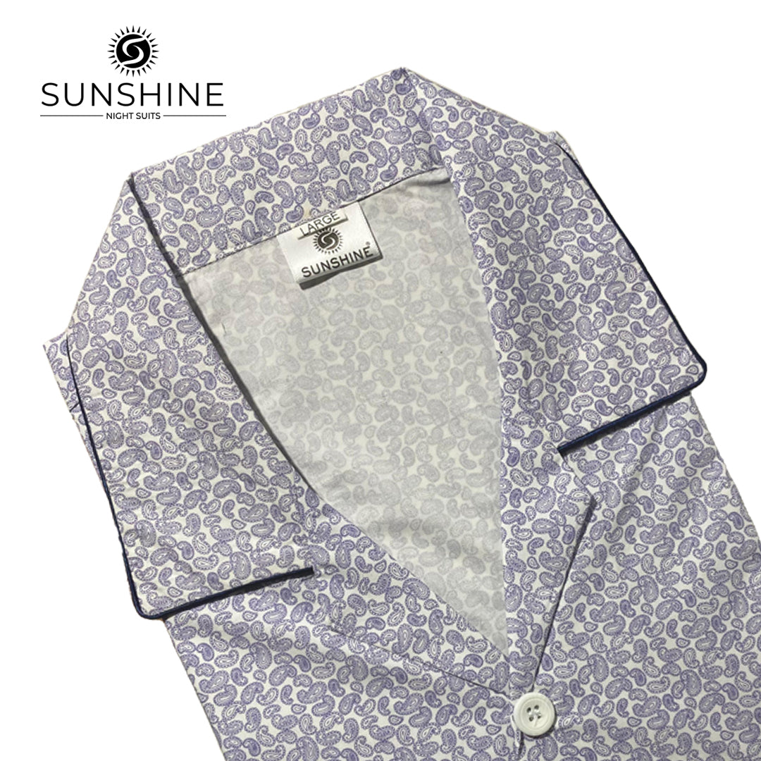Experience ultimate comfort and style with our MCN-53 Light Blue Paisley Printed 100% Cotton Night Suit for men. Made from imported cotton fabric, this set includes a pajama with an elastic waistband and a side pocket for added convenience. The full-sleeved shirt features a front patch pocket and stylish contrast piping, adding a sophisticated touch. The pajama is designed with a button fly closure for ease. This cozy and functional night suit offers style and comfort, perfect for a restful night's sleep.